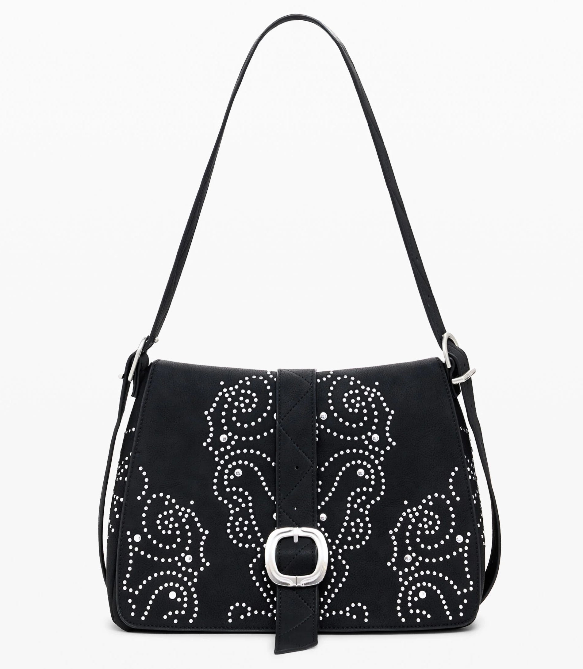 Descrizione: Borsa a tracolla in tessuto effetto pelle, a tinta unita, con dettaglio di borchie metalliche, tracolla regolabile e chiusura con cerniera.